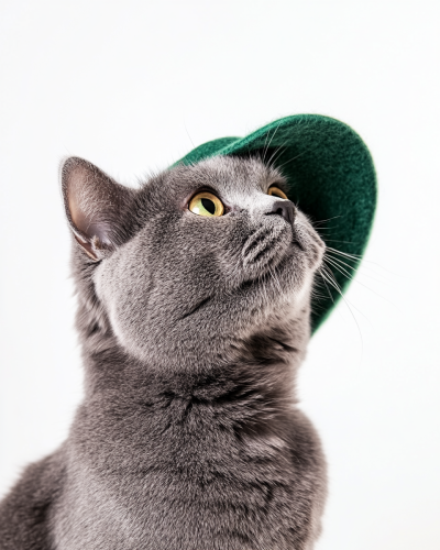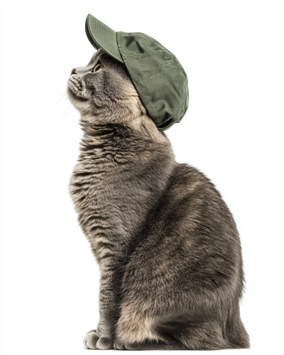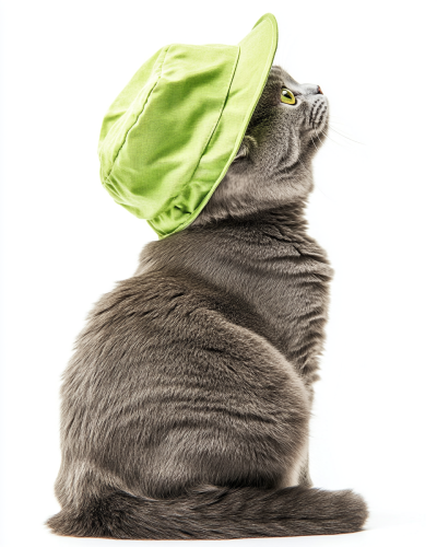 back profile photograph of a stocky british shorthair cat with green travel hat is looking to the top right corner, happy expression, back view, isolated on white background --ar 4:5 --style raw