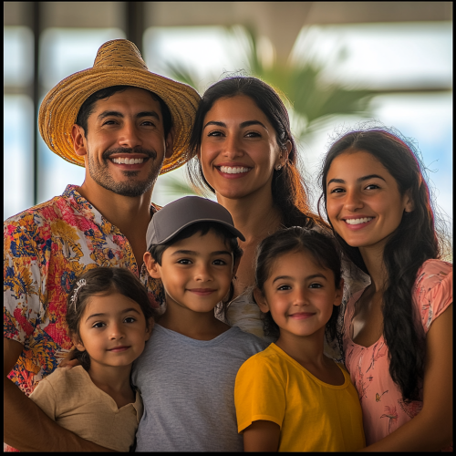 create a stock photo of a happy latin american family at airport on vacation trip, airport background, vibrant, UHD, high-quality, focused, photo taken with nikon d750 ultra - detailed, super detailed, full color, volumetric lighting, high contrast, 32k