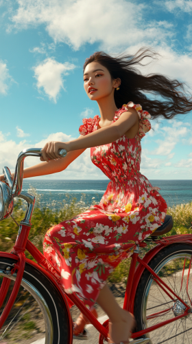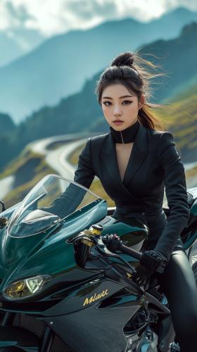A young Japanese woman with her hair styled in a neat bun sits atop a striking green MV Agusta F4. She wears a stylish black suit with a pencil skirt, projecting a sense of power and sophistication. Her confident expression and the way she holds the handlebars convey a love for adventure. The background features a scenic view of a winding mountain road, enhancing the thrilling atmosphere of the scene. Highly detailed, photorealistic with mountain backdrop, 8K resolution --ar 9:16 --v 6.1 --style raw