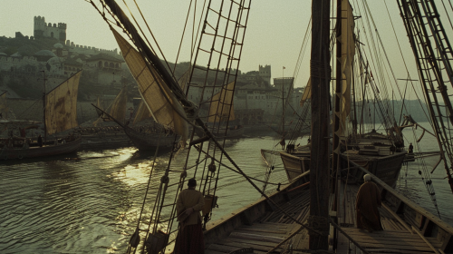 a photograph of a quayside in the distance taken from a ship in India in the 1400's . still from a movie, Ridley Scott style. --ar 16:9 --s 50 --v 6.0