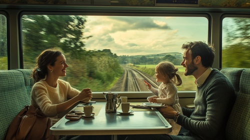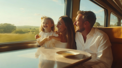 a happy, smiling 34 year old fashionable UK couple and their 5 year old daughter, they are on a modern UK train sitting at a table, see the countryside speeding by through the window, shot by steve ketner