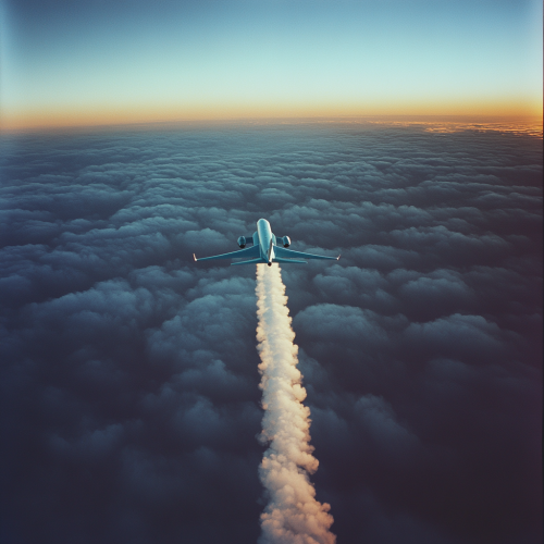 9:16 wide angle of aA 4K Kodak film photo above a six to eight, eight seat jet, that is the color turquoise, flying over the clouds during a sunset, plane is over the clouds, and take a shot as if it was a nice airline photo. There's also a straight line of smoke from the back that trails the plane. I make this a very relaxed feel.