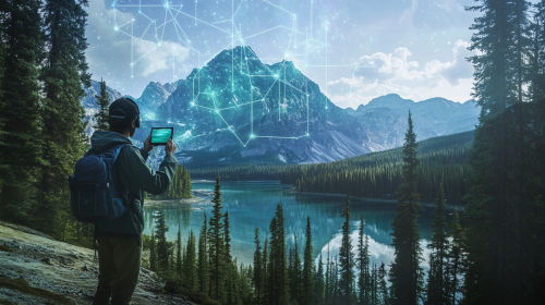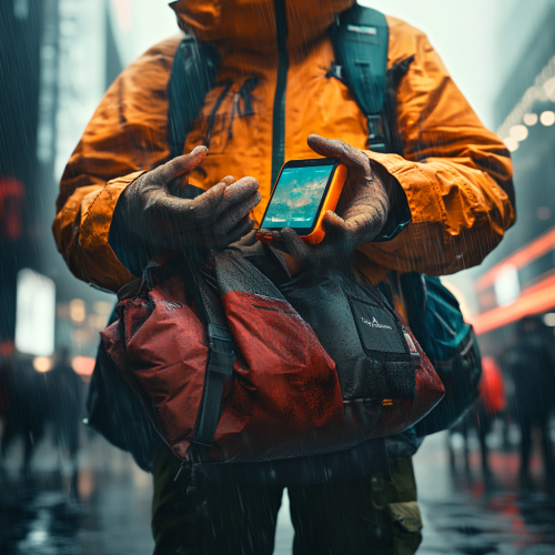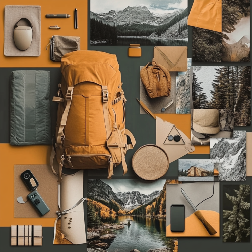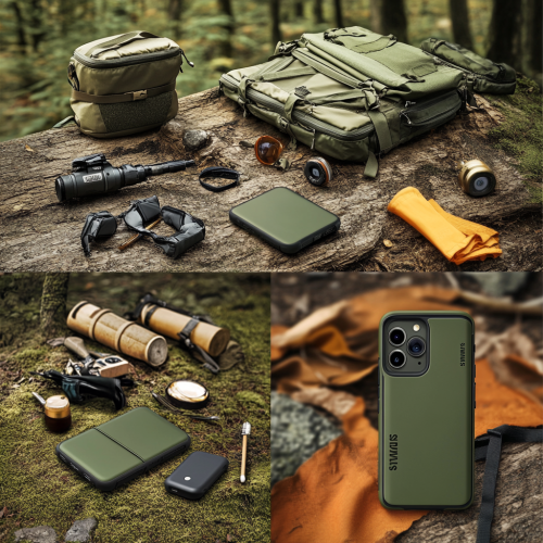Make a mood board theme for samsung galaxy s24 phone with speck products presidio 2 pro case with the theme of outdoor camping adventure, used for a promotional event, The collage should be interesting and dynamic showing different camping props and outdoor equipment
