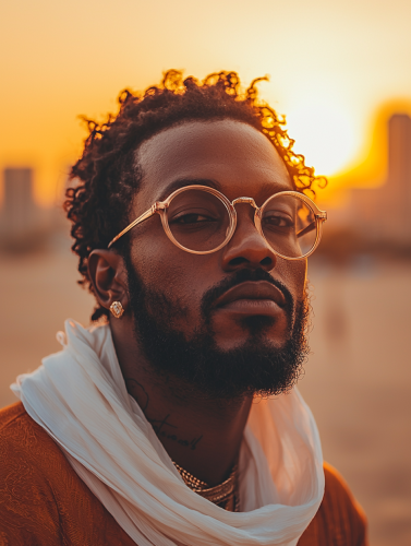 photo of African American man with Arab wife and daughter in the desert of Dubai during the sunset. The African American man is wearing glasses, and new school red baggy t shirt, and a white scarf covering his head, took from iPhone 16 --ar 3:4 --s 750 --q 2