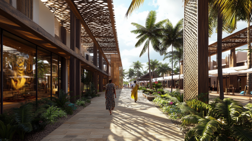 a modern pedestrian plaza inside of a modern ferry terminal development in Zanzibar. The plaza shold be inspired by the concept of trade winds. --ar 16:9