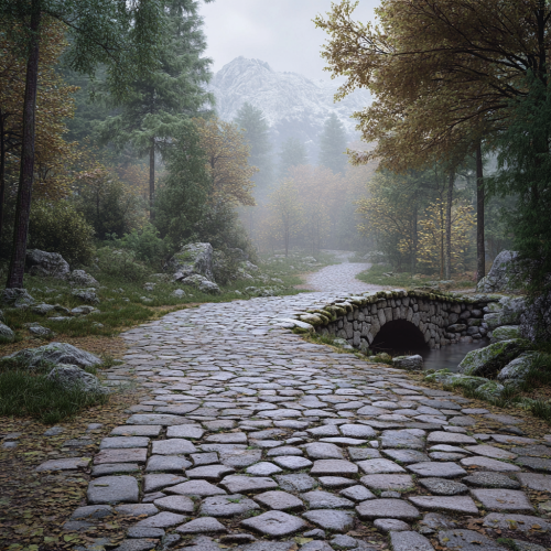 I want a realistic high definition picture (3400 x 2700 pixels) of a landscape with a cobblestone road. Important: the horizontal road runs across the image from left to right. On the right side of the image, the road crosses over a stream via a small stone bridge.