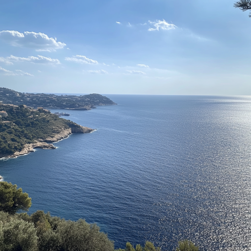 Mediterranean sea font view, we can see the blue sea and the blue sky sunny day with small clouds, we can see some land on the left, the lan is in the style of south of france