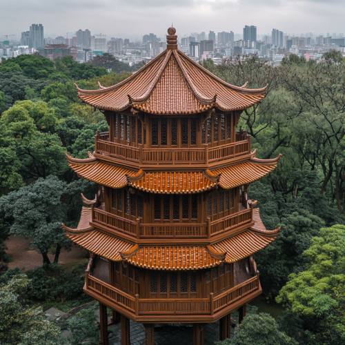 photorealistic aerial perspective image of taiwanese pagoda, wood post and beam structure and wood lattice facade, overcast taiwanese day Sony Alpha 7R V, 35mm lens, f/16, soft natural light, ISO 250, 1/60 sec, --v 6.1