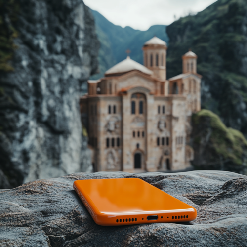 A realistic photo featuring a 3D orange smartphone icon in front of the Sürmene Monastery. Sürmene Monastery is located in Trabzon, the central city of Trabzon province in Turkey. Trabzon (Greek: Τραπεζούντα, Trapezounta; Laz: Ťrabuzeni) is situated in the Eastern Black Sea region, with a coastline along the Black Sea. Today, it is the second-largest city in the Black Sea Region after Samsun. Following a law passed on November 12, 2012, Trabzon gained metropolitan status, and the central distric