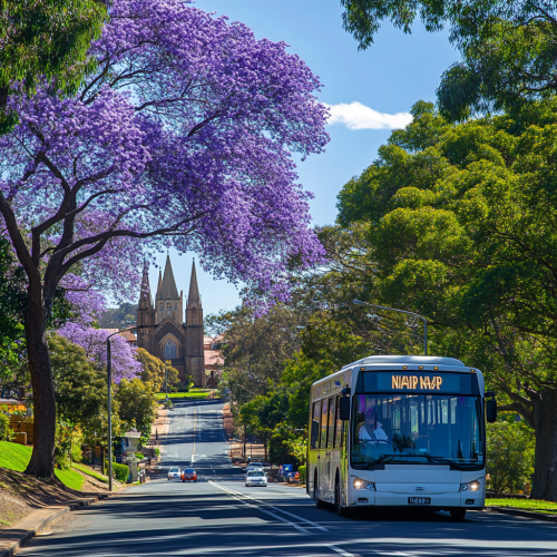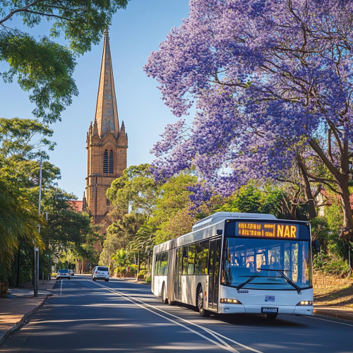 australian city background, Australian style passenger bus with destination display that says NAR beautiful clear summers day, traditional church to the left tress are in season jacarandas
