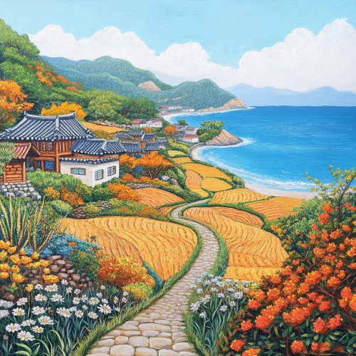 Island landscape with terraced rice paddies under autumn skies, peaceful coastal walking path lined with autumn flowers, gentle waves, ocean view with traditional Korean houses, a slow, relaxing vibe
