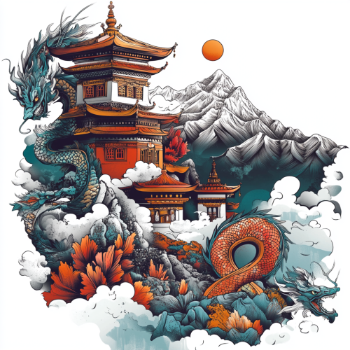 photographic detail, Bhutan t-shirt logo design, with lucky symbols, dzongs and mountains, white background, super high resolution, use some of the colors from the Bhutan flag and a dragon --v 6.1