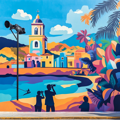 A colorful and vibrant mural inspired by Puerto Berrío, featuring shadows of young people taking photos of an iconic church. In their cameras, the captured image of the church is partially visible, creating a dynamic and modern effect. The background includes key landmarks of Puerto Berrío, blending them into a style that resembles an Instagram post. A fisherman casting his net over the river is part of the scene, with vibrant, lively colors reflecting the culture of the region. Text elements like '#PuertoBerrio' and '#DiscoverOurHeritage' are incorporated as if written in a social media overlay, and the whole image is framed to resemble a live Instagram post, giving it an interactive, youthful vibe. Photorealistic shadows, bright colors, and intricate details make this mural visually engaging and 'Instagrammable.
