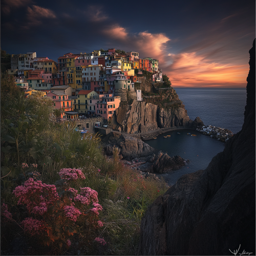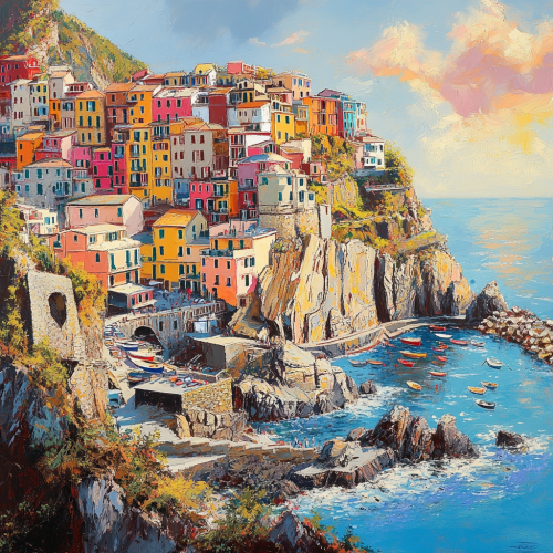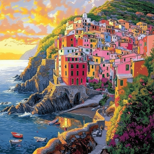 An incredibly breathtaking view of Cinque Terre in Italy, highlighting the vibrant, colorful villages perched atop dramatic cliffs overlooking the sparkling Mediterranean Sea. The buildings are painted in stunning pastel shades of pink, yellow, orange, and red, cascading down the rocky slopes towards the coastline. Golden sunlight warms the scene, enhancing the vibrant hues and casting a soft glow over the village. The crystal-clear sea glimmers under the sunlight, dotted with small boats, while the surrounding cliffs and lush, terraced vineyards add depth to the landscape. The sky is mostly clear with a few delicate clouds, creating a timeless, serene atmosphere in this iconic Italian coastal paradise.