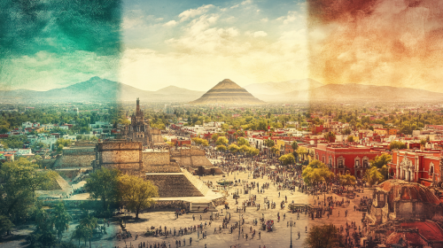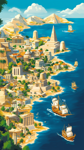 Illustrate Crete Island located at the center of the Mediterranean, showcasing its significance as a key junction for the convergence of Eastern and Western cultures. In the center, depict a detailed map highlighting the island's position and surrounding waters. Surround the map with symbols of diverse cultures, such as ancient Greek temples, Egyptian pyramids, and Eastern pagodas, representing the fusion of different traditions. Include scenes of ancient merchant ships sailing across the waters, illustrating vibrant trade and cultural exchange. The background features the deep blue Mediterranean Sea and sunlit Crete, creating a lively and historical atmosphere --ar 9:16
