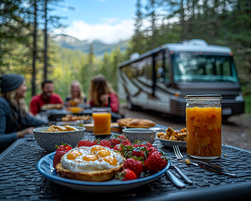 In the background a shot of a family having breakfast on a table in front of an RV at 10am in the forest, photography, beatiful blue sky, shot with a Nikon Z7 II, 50mm f/1.4 lens, vibrant colors --ar 5:4 --v 6.1 --s 1000 --style raw --no tents around --q 2