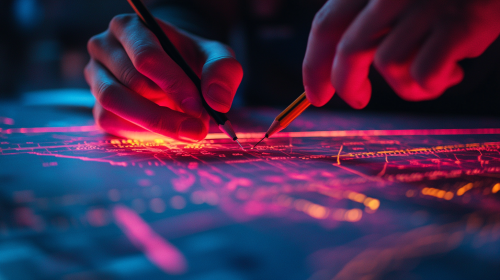 a background for a title slide on the theme of flight planning. feature two hands using a ruler and a pencil to mark a straight line between airports on a navigation chart. photorealism. dazzling fluorescence. --ar 16:9