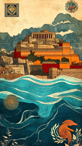 A captivating cover illustration featuring the azure Aegean Sea gently lapping at the shores of Crete. In the center, the majestic Knossos Palace is depicted with intricate architectural details and beautiful frescoes. Surrounding the palace are ancient artifacts and symbols representing Minoan civilization. The overall color scheme is bright and layered, designed to capture the viewer's attention and spark curiosity. --ar 9:16