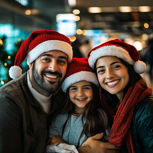create a stock photo of a happy latin american family wearing christmas hats at airport on vacation trip, airport background, vibrant, UHD, high-quality, focused, photo taken with nikon d750 ultra - detailed, super detailed, full color, volumetric lighting, high contrast, 32k
