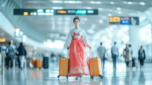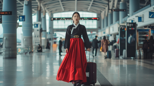 Create a cinematic scene set in Incheon International Airport. An attractive woman in her mid 20s walks directly toward the camera, positioned at the center of the frame. She is dressed in a highly modernized version of the traditional Korean hanbok, featuring a black top (jeogori) and a knee-length red skirt. The outfit blends traditional elements with a strikingly contemporary twist, making it bold and fashionable. The woman confidently pulls two suitcases behind her, one in each hand, as she maintains a blank, stoic expression. The modernized hanbok stands out against the bustling airport, with travelers moving in the background and signs in Korean and English overhead. Canon EOS-1D X MARK II, 4K, Beautiful Lighting, high resolution, intricate details --ar 16:9 --v 6.0