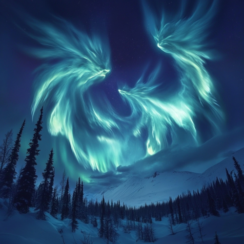 A beautiful photograph of the northern lights in Svalbard. The sky is blue-violet with dramatic shapes of green light coming from the northern lights. At the bottom of the photograph are silhouettes of trees. There is snow on the tops of the small mountains around them. A magical atmosphere. In the style of National Geographic magazine --s 250