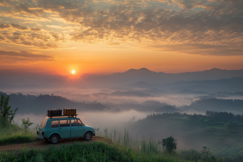 a tiny old Japanese car with suitcases on top is in the distance of an amazing and spectacular sunrise scene in a landscape of Italy and Thailand --ar 3:2