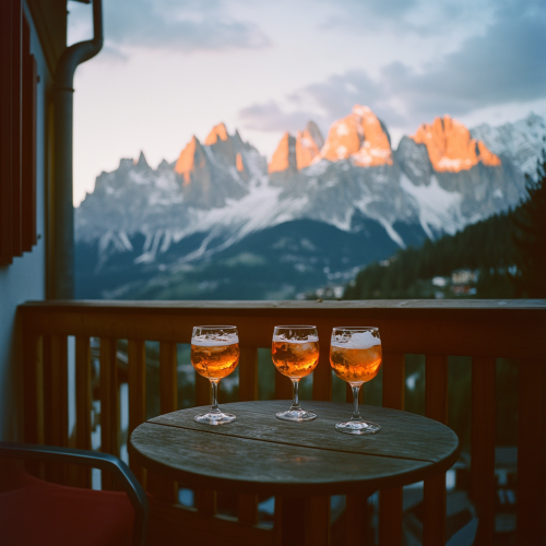 a high resolution colour photograph taken on a leica Q2 at 28mm, f18, of the italian alps from a cosy indoor terrace with glasses of aperol on a low table