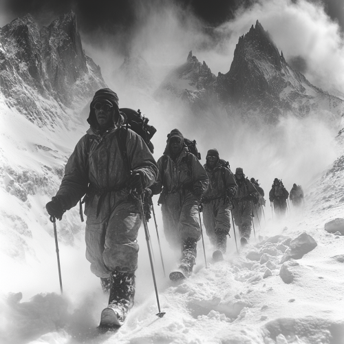 Group of experienced skiers in 1950s winter clothing, trekking through deep snow in an isolated, foggy mountain pass, harsh and cold environment, determined expressions, sense of adventure, desolate and haunting landscape, Portrait Perfect --v 6.1 --s 750