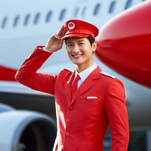 Create a realistic full-body from head to shoes image of a commercial airline pilot standing in front of an airplane, wearing a red-and-white uniform. The pilot smiles warmly into the camera, raising one hand to their forehead in a casual salute to convey reassurance and friendliness. Ensure that the cap worn by the pilot has no visible logo. The background should show part of the airplane, emphasizing an airport setting with natural daylight. --v 6.1