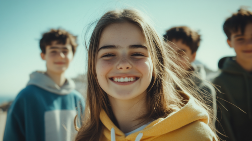 A Group of teenagers around 18. years old. Cute smiling wearing cozy hoodies without laces. One girl in the foreground. The Background is blurred. In the Background are also Boys. The Weather is sunny and they are near the coast souther spain. --ar 16:9