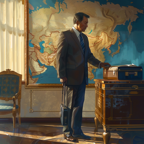 A distinguished political leader in a suit, carefully packing a suitcase in an elegant office, a map of Central Asia on the wall with highlighted borders of Kazakhstan. Muted golden and slate blue tones, soft lighting, realistic style --v 6.0