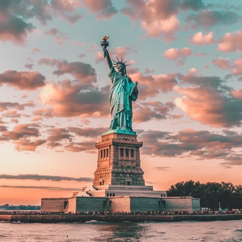 A dynamic sunset photograph of the Statue of Liberty, glowing warmly in golden light, set against the pastel pink and orange sky. The waves of the Hudson River glistening below, subtle clouds drifting by. Vibrant, high-definition details, shot from a low angle, dramatic lighting, perfect for social media engagement --ar 1:1 --v 6.0