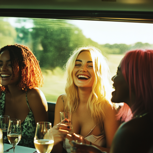 a happy 30 year old blonde female influencer, she is with two female friends, one girl is black and the other has vivid short red hair, they are on a train all sitting at a table drinking wine, through the train window we can see it is sunny and lush countryside environment speeding past, shot by steve ketner --ar 1:1