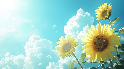 Three sunflowers in the lower right corner of the image, with a blue sky and white clouds in the background, minimalist, lots of white space, computer wallpaper, high resolution, natural light, National Geographic photo --ar 16:9 --v 6.1 --quality 2 --stylize 250