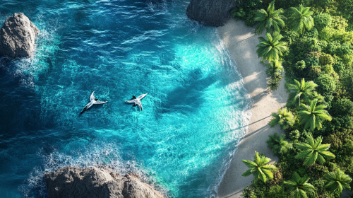 aerial view, azure blue ocean with few dolphons underwater. a part of a tropical island shown with sand beach and palm trees, all from above, photorealistic, sparkling --ar 16:9