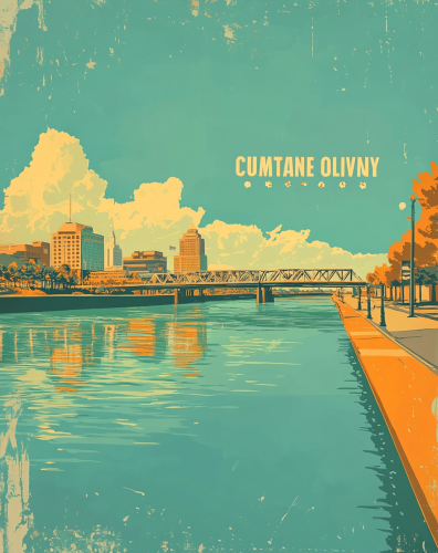 A vintage-style travel poster of Louisville Kentucky in summer. The city features the bridges and the river. A calm river reflects blue sky above. Artwork style inspired by mid-century design aesthetics. Bright colors and detailed textures, with warm lighting to highlight the beauty of the city. Vintage color palette with orange hues for contrast. --ar 101:128