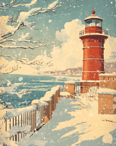 A vintage-style travel poster of South Haven in winter. The beach is covered by snow and ice. The light house is red. Artwork style inspired by mid-century design aesthetics. Bright colors and detailed textures, with warm lighting to highlight the beauty of the city. Vintage color palette with white hues for contrast. --ar 101:128