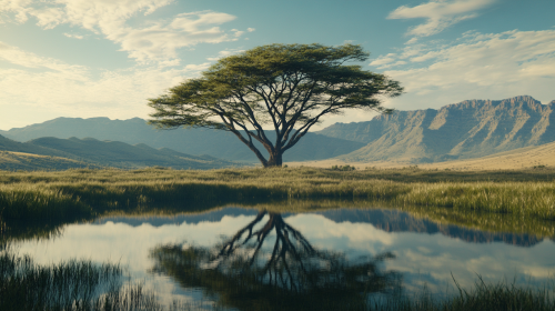 the image is a natural and cinematic , taken with a Sony a1 using a 50mm 1.2 G Master lens, lush african savannah landscape, small lake in front, high details, original photography --ar 16:9