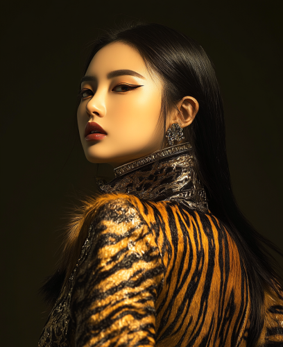award winning photography of a Chinese woman's body dressed in tiger fur, elegant, shoulders, sweet move, macro lenses 8K shutter speed detailed, ultra HD, cinematic, beautiful lighting, dynamic lighting, leather color, electric colors,wildlife photography, dramatic, octane render, unsplash, --ar 9:11 --p gdodf51 --style raw --s 33 --c 3 --v 6.1