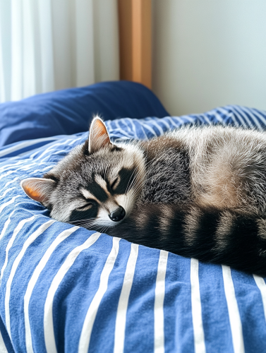Duck Raccoon, A photo of an adorable gray and white Duck Raccoon, curled up on the edge of its bed, basking in warm sunlight with closed eyes. The background is a minimalist bedroom with striped blue sheets that contrast beautifully against its soft fur. This shot captures the serene moment as the cat leans forward to rest its head on its tail while it enjoys the summer heat, creating a peaceful atmosphere. --ar 3:4