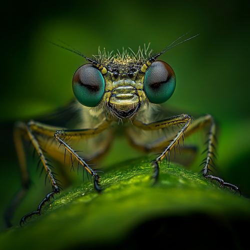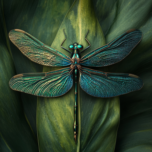 A hyper-detailed close-up of a dragonfly resting on a green leaf, medium: macro photography, style: National Geographic-style realism, with sharp textures and intricate detail on each wing and facet of its eyes, lighting: natural sunlight casting soft shadows, colors: vibrant greens and metallic blues with hints of gold, composition: captured with a Canon EOS-1D X Mark III, using a 100mm f/2.8 macro lens, shallow depth of field with the background softly blurred to emphasize the dragonfly’s features.