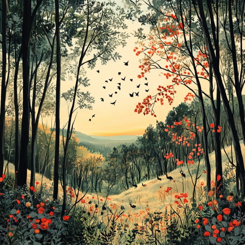 an illustration of a Forest landscape with Mésanges charbonnières Rouge gorge pic vert Pic noir Chevreuil Sanglier écureuil renard Hérisson Forêt ciel Chêne Chouette Petit rhône qui passe --s 250