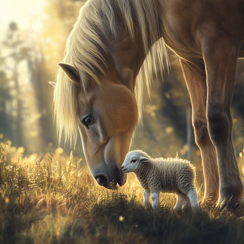 A gentle horse and a small, fluffy lamb grazing together in a lush, open field, with the lamb leaning affectionately against the horse's leg. Soft sunlight shines down, casting a warm glow on their peaceful friendship. Highly detailed fur, natural earthy colors, pastoral scene, digital art, 4K resolution.