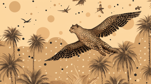 Chinoiserie-inspired wallpaper with a pagoda, elephant, and tiger in a jungle landscape, with many birds flying in the sky. Detailed and high-resolution. --ar 16:9 --v 5.0