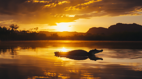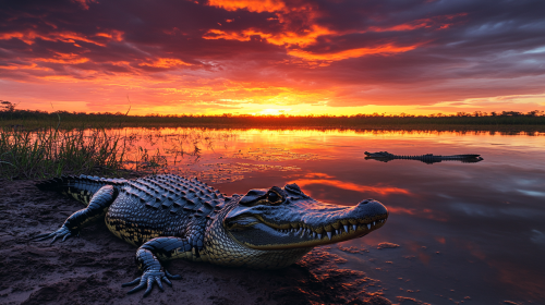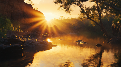 the image is a majestic and beautiful , taken with a Sony a1 using a 50mm 1.2 G Master lens, kakadu national park, high details, original photography, sunrise, 2 small crocodiles far away --ar 16:9