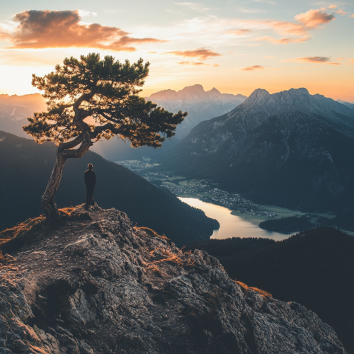 A distant shot of a solitary man standing beside a gnarled tree on the edge of a rugged mountain slope, gazing out over a vast expanse of mountains fading into the horizon, with a tranquil lake nestled between peaks. The golden hues of sunset cast a warm glow across the scene, deepening shadows and illuminating the landscape in a soft, ethereal light. Shot with a Canon EOS 5D Mark IV and a 70-200mm telephoto lens, the composition captures the grandeur of nature and the smallness of man, with a vibrant mix of orange, pink, and deep blue tones in the sky.