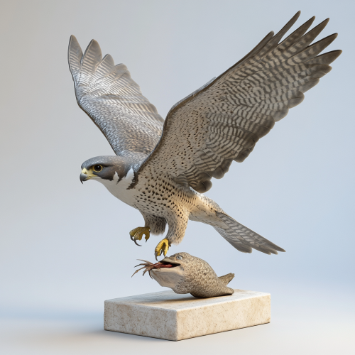 Create a sculpture of a peregrine falcon soaring upward, with a characteristic prey in its talons. The bird should be positioned on a rectangular base measuring 80 centimeters in height.