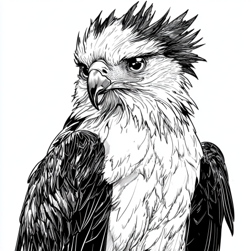 Philippine eagle, line art style, The tips of the eagles wings are flapping downward, Lineworks is strong but a bit messy, center view of the eagle, white background, black solid lines, stylized, semi-realistic sketch, the eagle has a full body with claws and big wings, high contrast