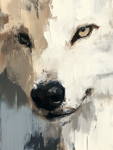 a painting of a close up of a white wolf in the style of Jeremy Mann artist, abstract modern, earth color, terre de sienne, little of yellowish color, pure, square, emotion, softness, purest, énergie, soft, long stroke, gentle, tender, luminous, realist eyes --ar 3:4