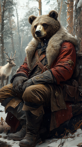 Imagine a full body shot of a [Russian noble] and [bear] hybrid with a human body and the head of a sleek [bear]. [He] is seated casually on a [log] overlooking [snowy forests], wearing a [fur-lined] outfit complete with a [ushanka hat] and a finely crafted [leather coat]. The blend between the human and [bear] parts is smooth. The background features [frozen trees] with grazing [reindeer] and the [Ural Mountains] in the distance, UHD --chaos 20 --ar 9:16 --stylize 750 --v 6.1